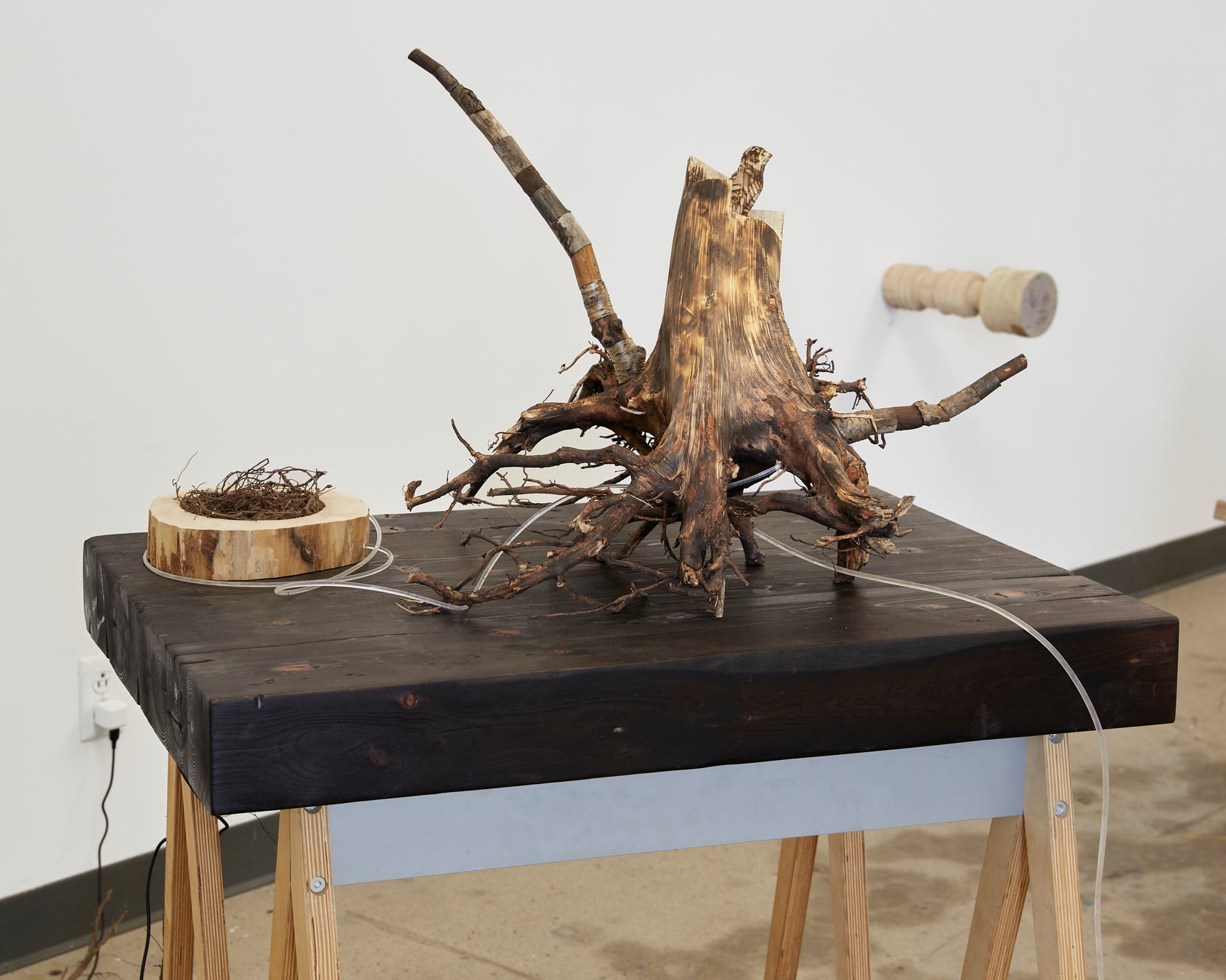 物質の厚みと時間の奥行きを木材の年輪に重ね、光や時間など目に見えないものの可視化を試みています。2023年ケベック州で発生した森林火災のリサーチを通じて、単なる災害ではなく、生命の循環に必要なプロセスであることを理解するに至りました。滞在直前に起きたアイスストームによる甚大な被害を目の当たりにし、倒木した木材を収集し、自然災害と循環に焦点を当てた作品を発表します。