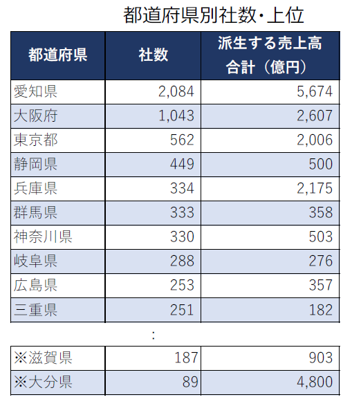 また、社数は多くないものの滋賀(竜王)工場のある「滋賀県」や、子会社であるダイハツ九州が拠点を置く「大分県」では、県内企業に派生する売上高が大きく、「滋賀県」187社・903億円、「大分県」89社・4,800億円となっている。