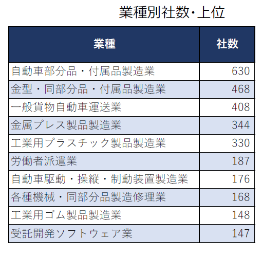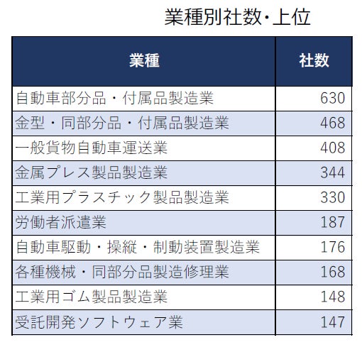 ただ、部品等を搬送する「一般貨物自動車運送」(408社)や「労働者派遣業」(187社)、車両の電子化が進む中で「受託ソフトウェア開発」(147社)なども多く、国内有数の産業でもある自動車産業だけあって、業種の裾野は広い。