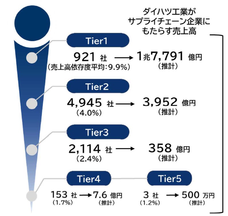 ダイハツ工業を頂点とするサプライチェーン企業(売上高の1%以上を依存している企業)は、国内に推計8,136社あることが判明した。同社と直接取引のあるTier1は921社、二次下請けであるTier2が4,945社、Tier3が2,114社と続く