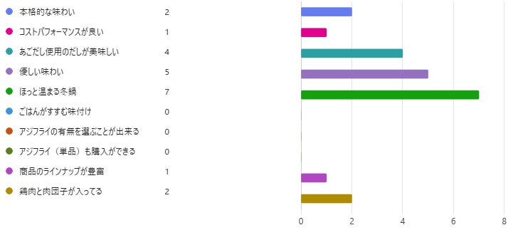 最も多くの票を集めたのは『ほっと温まる冬鍋』というポイントでした。2位は『優しい味わい』、3位は『あごだし使用のだしが美味しい』でした。