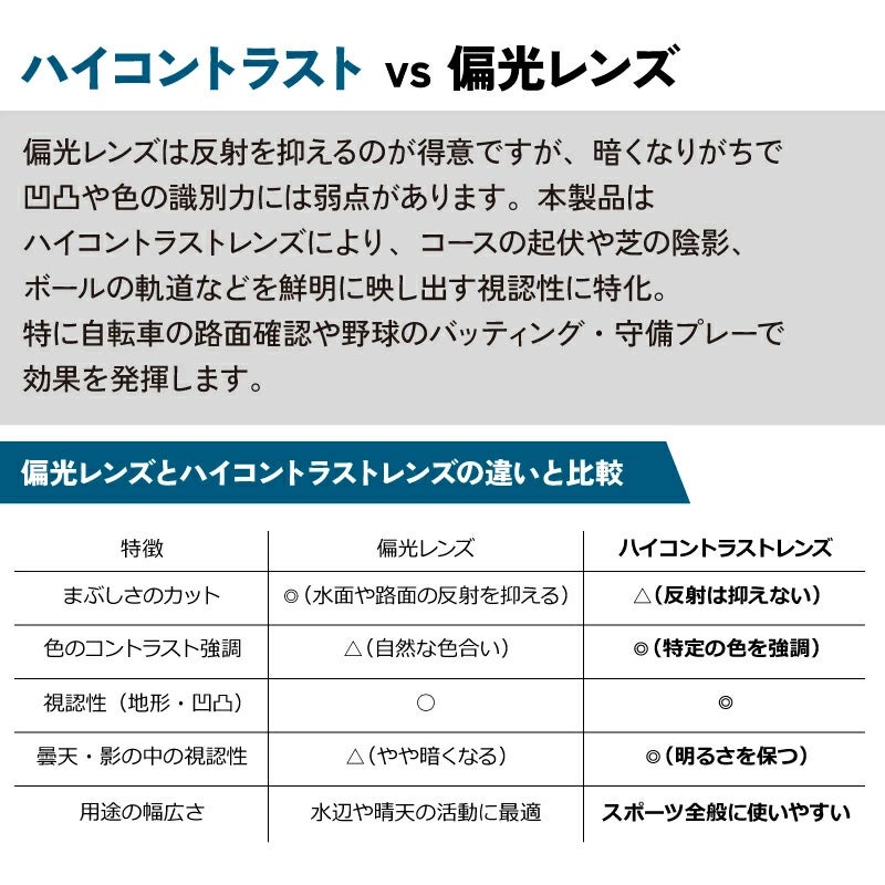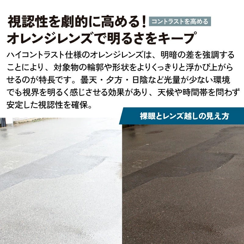 PCカラーハイコントラストレンズ /可視光線透過率:(VLT)8-18%/インナーフレーム装着:可能/レンズコーティング:100%コーティング