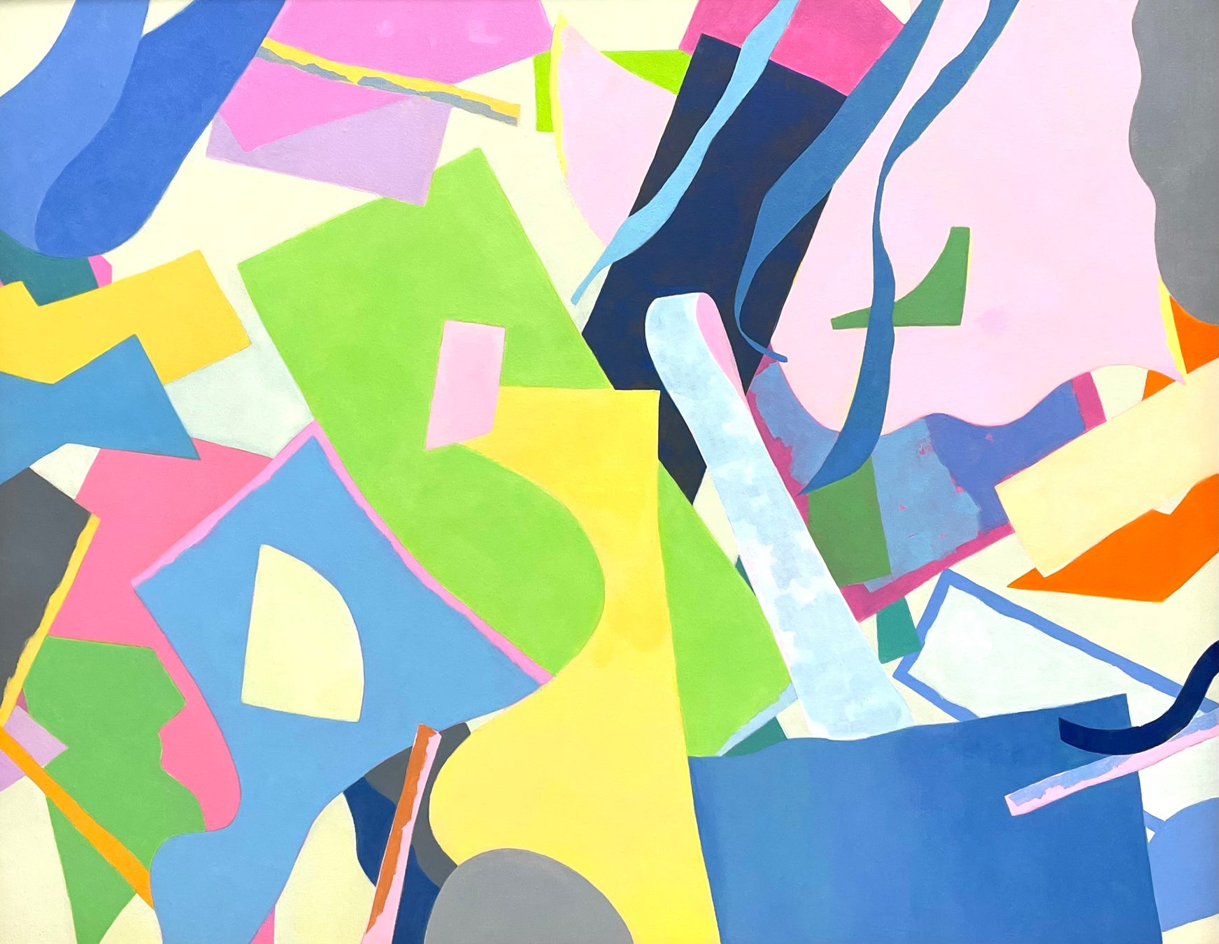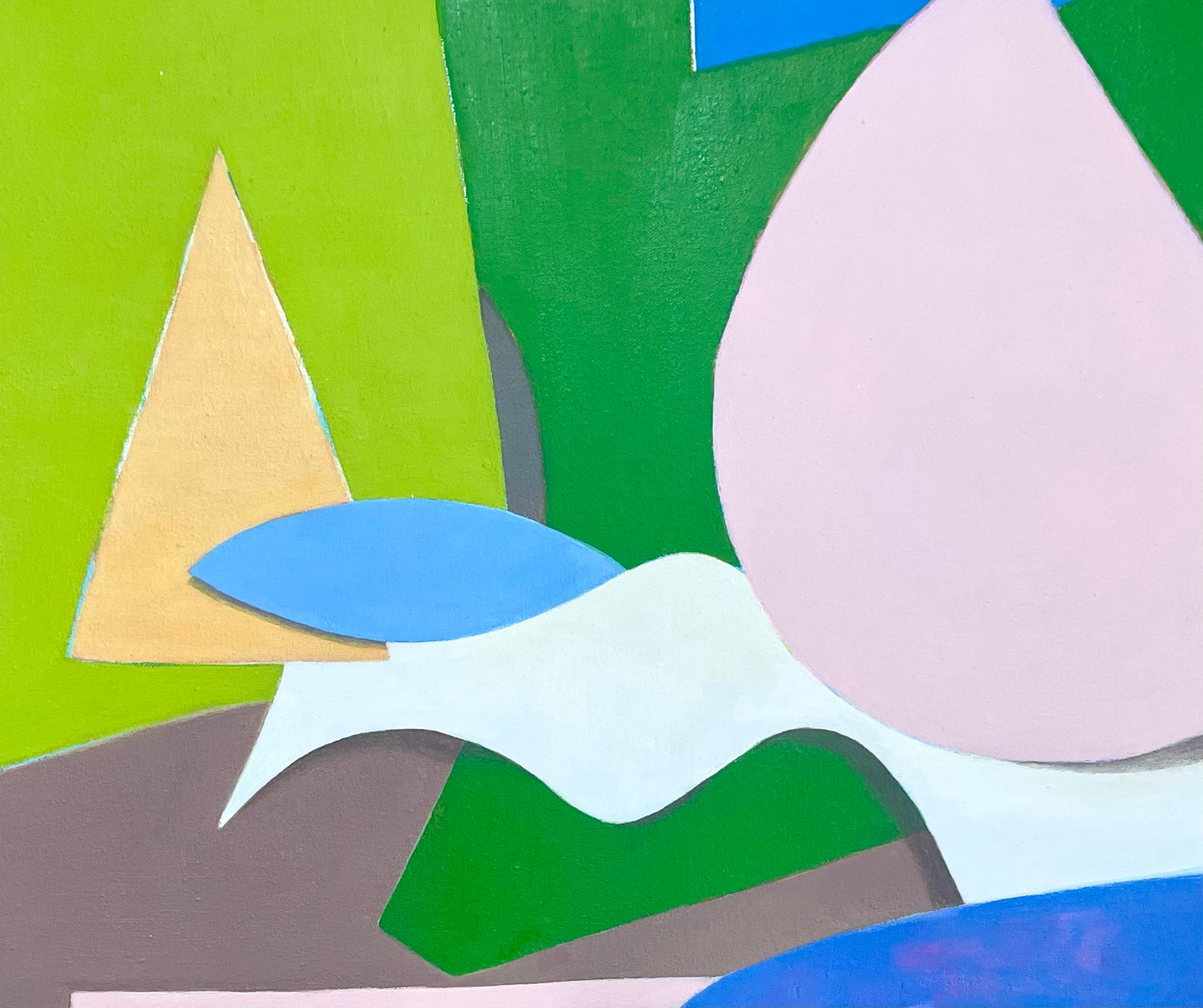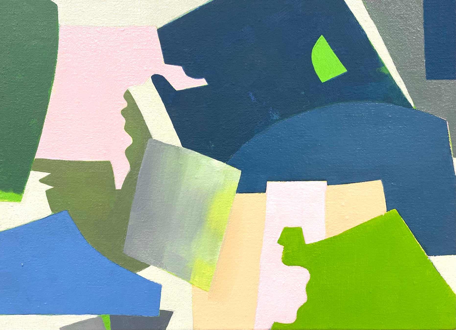 木津本の作品は大きく二つの工程を経て作られています。まずランダムに切ったフェルトを準備し、これらを床に放り投げるように置いたり、手でシャッフルすることで描くモチーフを作ります。そして、ふと何か良いと感じるフェルトの配置をキャンバスに描いていきます。モチーフのフェルトは使い回すことで、別々の作品に同じ形のフェルトが登場したりします。これは言語において繰り返し使われる言い回しのように、冗長性があり、「世界」を表現することにつながると木津本は語ります。絵画としてキャンバスに落とし込む際、必要な部分とそうでない部分とを取捨選択し、モチーフから受け取った情感を翻訳するように描いています。キャンバスに描かれた形や色が、鑑賞する者の記憶や意識とも自由に共鳴し、フェルトが「何にでもなること」を意識しています。本展ではP80号(1455×970mm)の大作を中心に、新作を展示します。