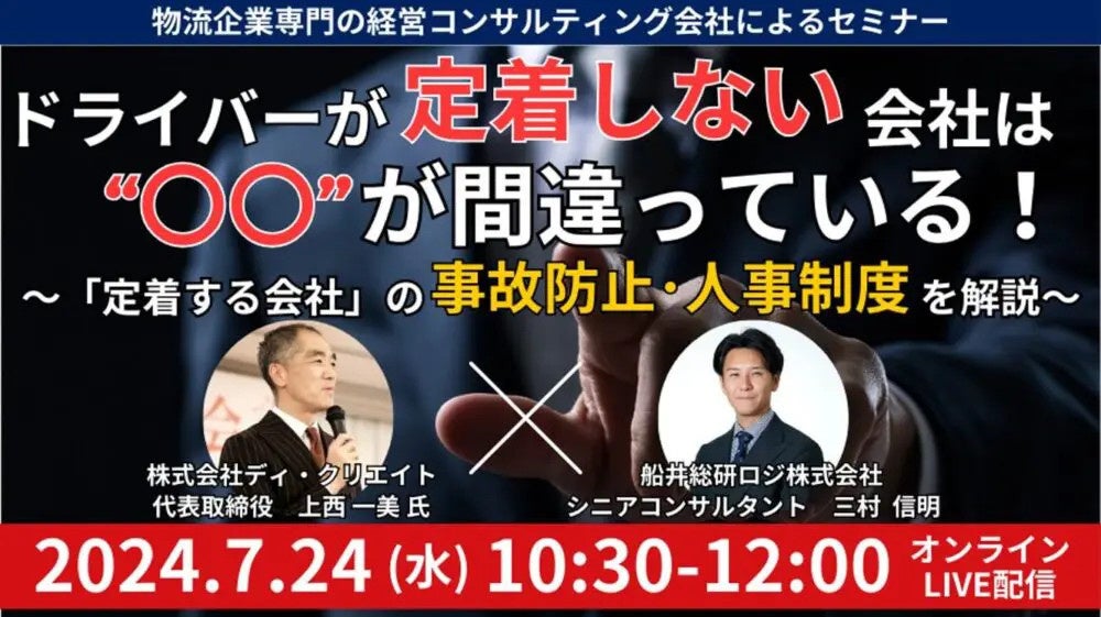 日本最大級の物流コンサルティングファーム 船井総研ロジ株式会社(本社:大阪市中央区、代表:橋本直行、以下「船井総研ロジ」)は、2024年7月24日(火)10:30~12:00、運送会社・物流会社の経営者の方々を対象にした「事故防止・人事制度セミナー」をオンラインで開催いたします。