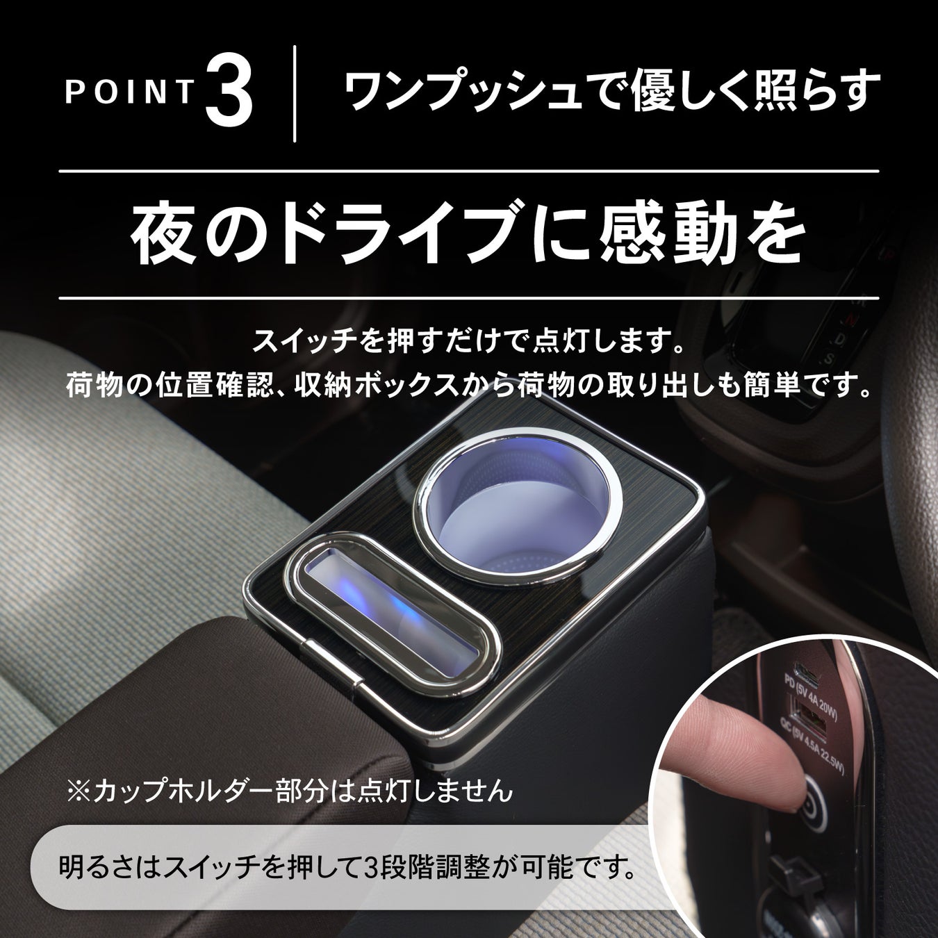 N-WGN JH3/JH4専用 LEDコンソールボックス。タイプA、タイプCシガーソケットを完備。夜も安心のLED搭載。大容量の収納ボックスは散らかりを一瞬で解決。設置はベンチシートの上に置くだけ。