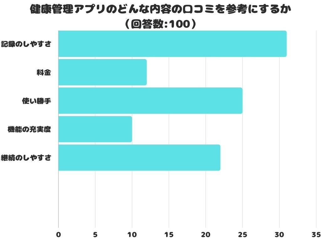 健康管理アプリのどんな内容の口コミを参考にするかをアンケートにて調査したところ、1位は「記録のしやすさ」でした。