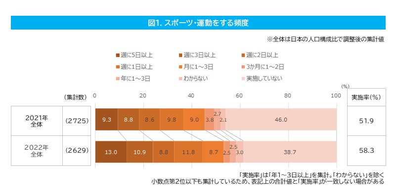 - 1年前と比べスポーツの実施率が上昇、スポーツをする日数も増加傾向