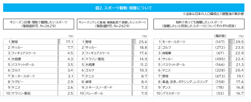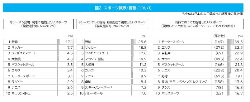 - 会場観戦意向では「野球」、有料視聴意向は「モータースポーツ」がトップ