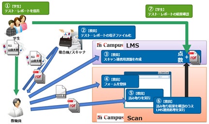 このような状況の下、「in Campus Scan」では、テストやレポートなど採点済みの手書きの英数字を読み取り、学生情報のリストと照合させることで採点結果を自動集計し、成績処理の業務効率化を実現します。また、「in Campus シリーズ」との連携により、採点結果の集計から学生/生徒へのテストやレポートの返却まで、一連の工程を「in Campus シリーズ」上で実現することが可能となります。