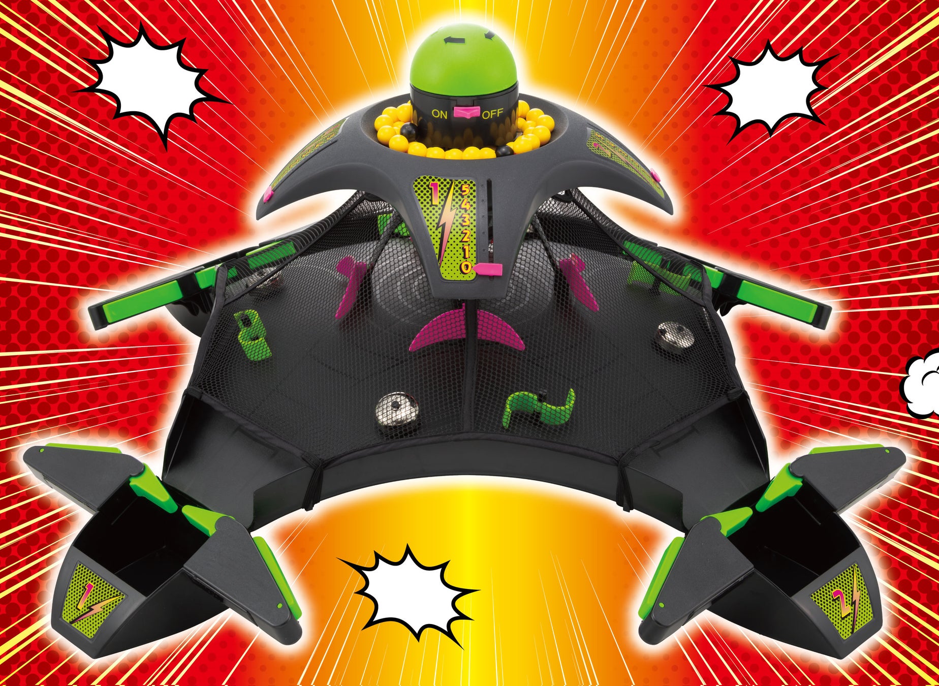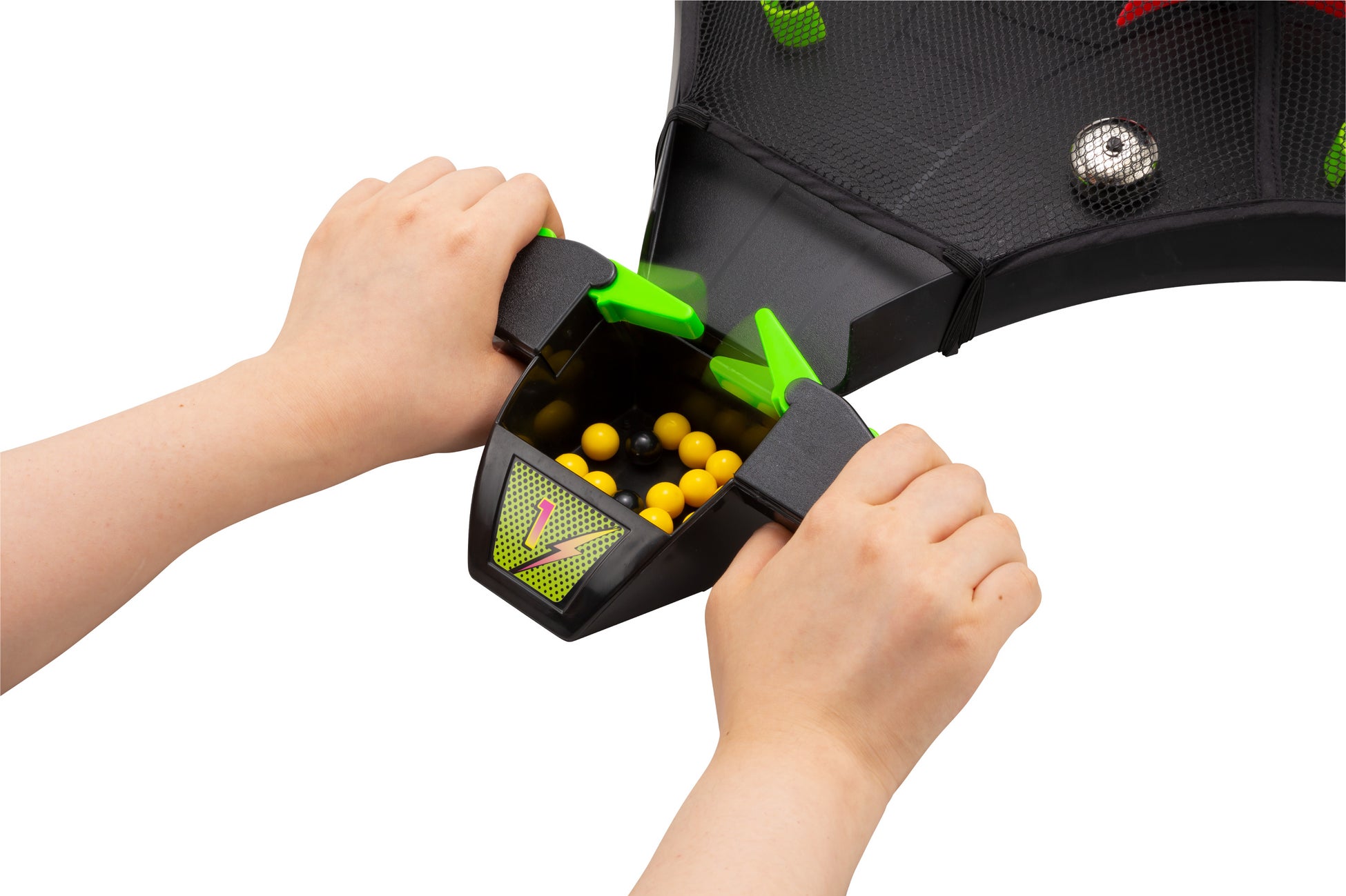 本体中央上部からランダムに落ちてくるボールをフリッパーではじいて相手のゴールにシュートします。はじいたボールがベルにあたると「チンッ!チンッ!」と鳴り、よりエキサイティングなゲーム展開になります。ボールが全て下に落ちた時点で、プレイヤー全員で自分のゴールに入ったボールをカウントし、一番少ない人が勝ちとなります。電池不要で2~4人まで遊べる、手に汗にぎる超エキサイティングなゲームです。