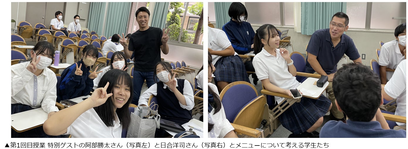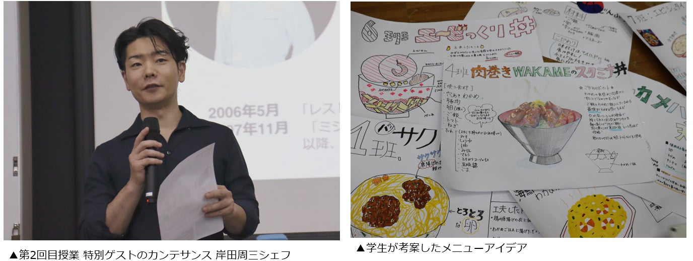 第2回の授業では、第1回授業で考えたメニューの最終仕上げ、そして、プレゼンテーションを実施しました。特別ゲストとして、品川区御殿山にお店を構える、ミシュラン三つ星レストラン「カンテサンス」のオーナーシェフ 岸田周三さんを迎え、三ツ星シェフのメニュー考案の際のコツやポイントを聞くことが出来、学生たちも新たな気づきを得て、メニューアイデアの仕上げを行いました。