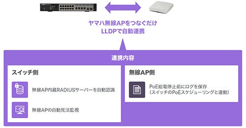 「LLDP自動設定機能」によるヤマハ無線LANアクセスポイントとの連携に対応しています。ヤマハ無線LANアクセスポイントと接続するだけで、スイッチ側では「無線LANアクセスポイント内蔵のRADIUSサーバーを自動認識」「無線LANアクセスポイントの自動死活監視」が、無線LANアクセスポイント側では「PoE給電停止前にログを保存(スイッチのPoEスケジューリングと連動)」が自動的に動作し、保守運用に便利な機能を手軽に使用することができます。
