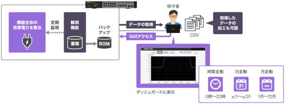 今回発売する4モデルは、当社ネットワーク製品として初めて「消費電力の見える化」に対応しました。「消費電力の見える化」は、機器全体の消費電力を独自の計算方法で算出し、統計情報として記録/表示する機能です(特許出願中)。「パフォーマンス観測機能」の一部として提供されるため、記録した消費電力の推移をWeb GUI上で簡単にグラフ表示することができます。機器全体の消費電力が可視化されることにより、無駄な電力消費に気づくことができるため、本機のPoEスケジューリング等を活用し、電力消費を適切に削減することができます。「消費電力の見える化」は、発売中の当社スイッチ製品のラインアップでも順次対応する予定です。