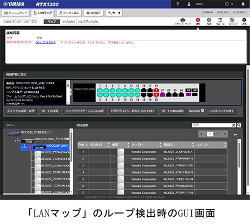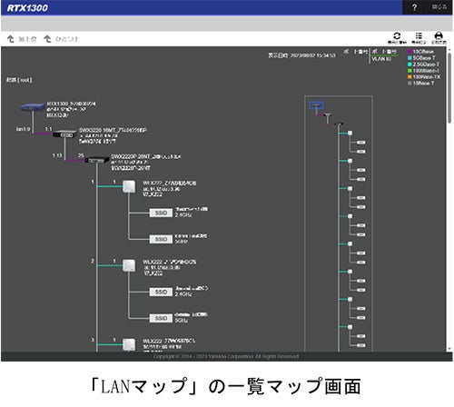 また、LANの見える化機能「LANマップ」での管理にも対応しています。ヤマハルーターやインテリジェントL2スイッチ、L3スイッチと組み合わせることで、本機に接続された端末を含むLAN全体のネットワーク状態を確認できるため、トラブル対応や日頃の保守・運用業務の負荷を大幅に軽減します。さらに、トラフィック量等の定常的な観測と最大1年分のデータ蓄積が可能な「パフォーマンス観測機能」にも新たに対応し、蓄積された過去の通信状況を容易に確認できるため、障害解析や需要予測にかかる負担を軽減します。加えて、無償のPCアプリケーション「Yamaha LAN Monitor」の最新バージョン(2023年11月より提供予定)をご利用いただくことで、個別にIPアドレスの設定をすることなく、複数台のスイッチのCONFIG管理やファームウェアの一括更新を実現し、キッティング作業の負荷も大幅に軽減します。