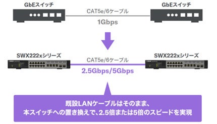 また、有線LAN環境の高速化を低コストで実現します。今回発売する4モデルは、2.5/5ギガビット通信のために既設Cat5e/6ケーブルを利用できるため、LANケーブルの張り替え工事を行うことなく、従来の1ギガビット環境を2.5/5ギガビットの高速環境に置き換えることが可能です。さらに、アップリンクポートとして10ギガビット対応のポートを利用することで、上位のネットワーク機器との間のボトルネックを低減し、収容した機器の通信を高速なまま上位機器に転送することができます。必要な通信量の増加が予想される中、10ギガビットネットワークのフロア/アクセススイッチとして、長期間ご使用いただけます。