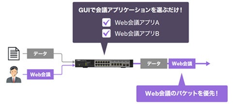 近年使用機会が大幅に増加しているWeb会議アプリケーション向けのQoS設定をGUI上で簡単に設定できるようにしました。使用するWeb会議アプリケーションの種類をGUI上で選択するだけの簡単操作で、「Zoom Meetings」や「Microsoft Teams」といったWeb会議アプリケーションの通信を優先させることができます。また、リンクアグリゲーションの方式としてLACPにも新たに対応し、耐障害性の高いネットワークを実現します。