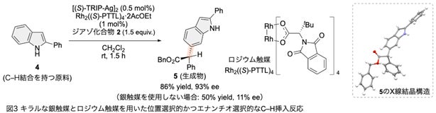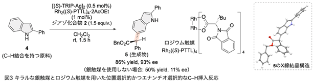 この触媒系の展開として検討を続けたところ、キラルな銀触媒とキラルなロジウム触媒を用いることで、C–H結合のエナンチオ選択的な官能基化も可能であることがわかりました(4→5、図3)。これまで同様の反応の選択性制御は最近の手法でも困難であり、低い選択性に止まることが報告されていました(参考文献2)。そのため、本研究ではAg/Rh触媒系の力量を強く示すことができました。