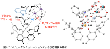 研究グループは、DFT計算(注8)を活用してN–H挿入反応のメカニズムを解析しました。その結果、銀触媒とロジウム触媒が相乗的に機能していることがわかりました。成功の鍵となる不斉プロトン化段階(注9)においては、図4のように三つの金属核とその配位子が不斉環境を構築することで、エナンチオ選択性が制御されていることがわかりました。これらの知見を基盤に、新たな化学反応の設計が期待できることから、その他のヘテロ原子–水素原子に対する挿入反応の開発や有用物質の合成など他の領域への波及効果も考えられます。