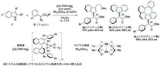 研究グループは、所有する触媒や入手容易な触媒を系統的に検討することで、幸いにもキラルな銀触媒とアキラル(注7)なロジウム触媒が、インドール類、カルバゾール類、またその他のヘテロアレーン類のN–H挿入反応に有効であることを見出しました(図2)。
