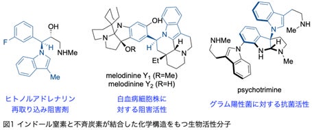 インドール窒素と不斉炭素が結合した構造を有する生物活性分子は、天然に広く存在します。それらの中には、医薬品として利用が期待される薬の種(たね)も含まれます(図1)。しかし、そのような利用価値の高い化学構造を合成することは容易ではありませんでした。合成するための化学反応の選択性が高くないため、望まない副生成物も同時に生成してしまうといった課題が残されていたためです(参考文献1)。