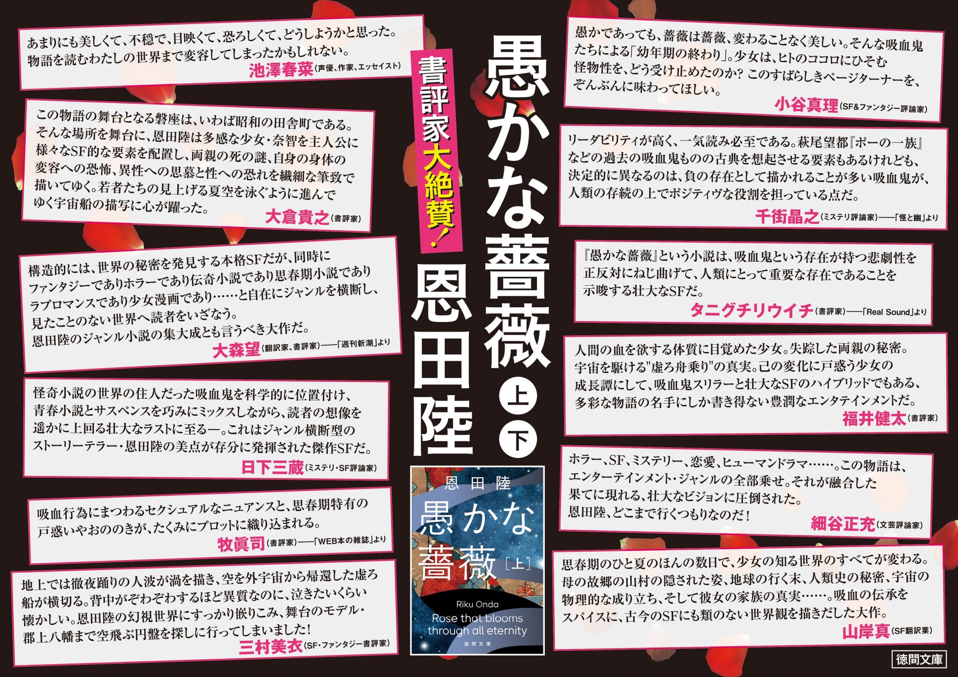 直木賞・本屋大賞W受賞作家・恩田陸氏の大長篇小説『愚かな薔薇』(上下巻)が、徳間文庫より発売! 評論家・書評家から数多くの賞賛が寄せられています!