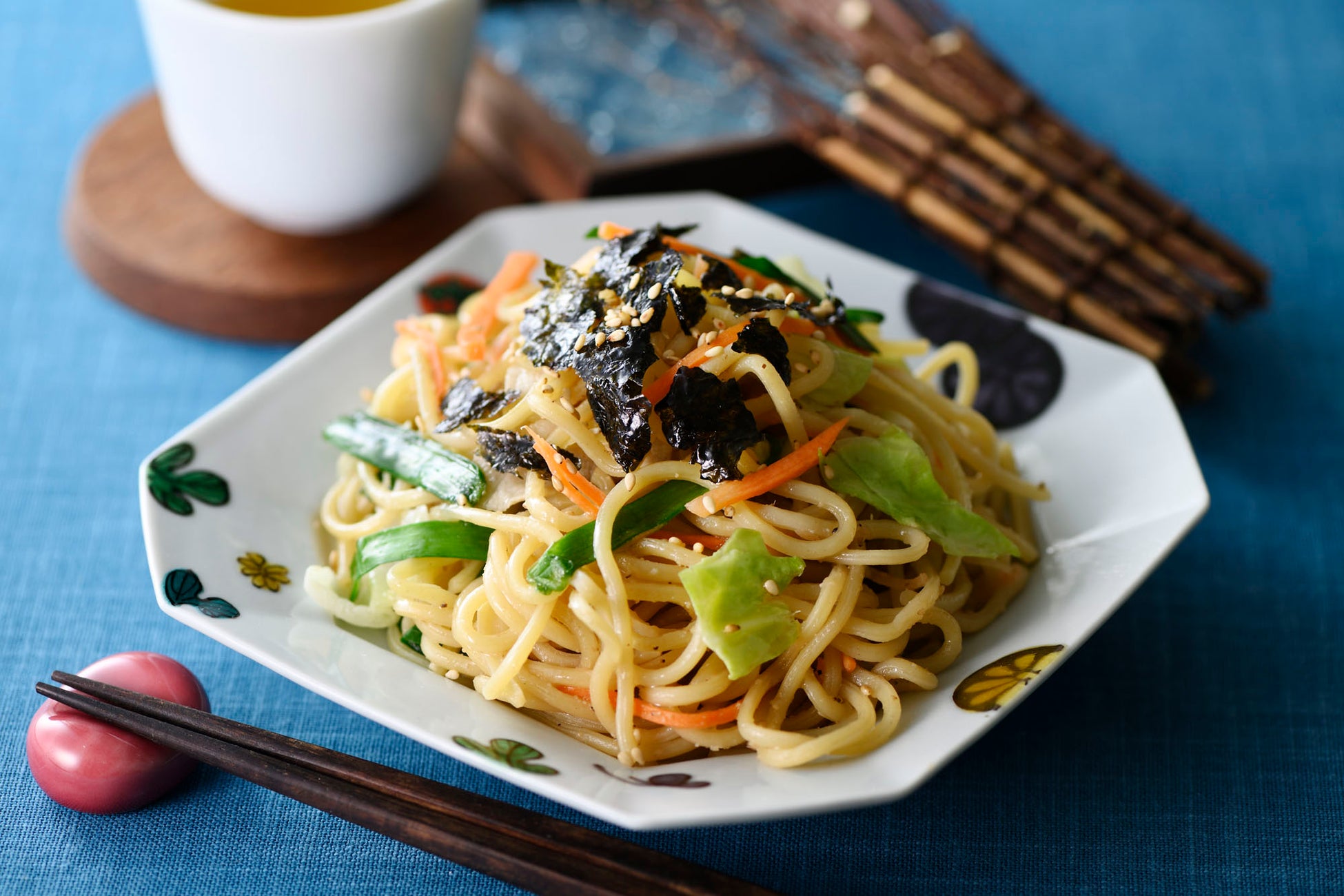 塩だれとゴマ油で合えた麺に、韓国のりをトッピングした韓国風創作料理。