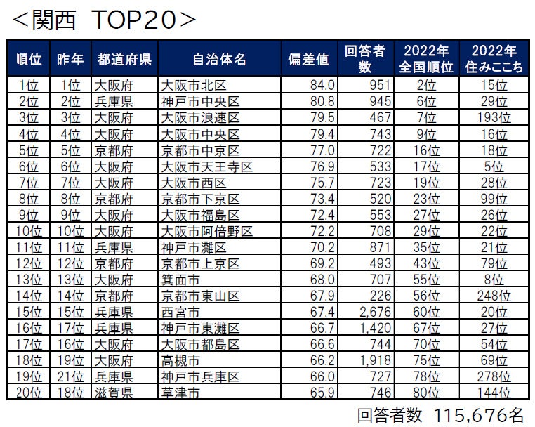 ●関西のトップ10は、順位変動はなく、昨年と全く同じ結果になっています。トップ20の地域別では、10自治体が大阪府、5自治体が兵庫県、4自治体が京都府です。