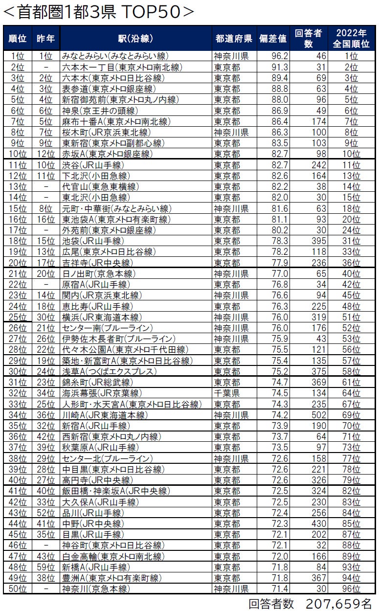 1位は2年連続でみなとみらいです。2位は、昨年は回答者数が30名以下で集計対象外だった六本木一丁目が初ランクイン、3位は、昨年は2位だった六本木です。トップ10のうち8駅が東京都に位置する駅です。