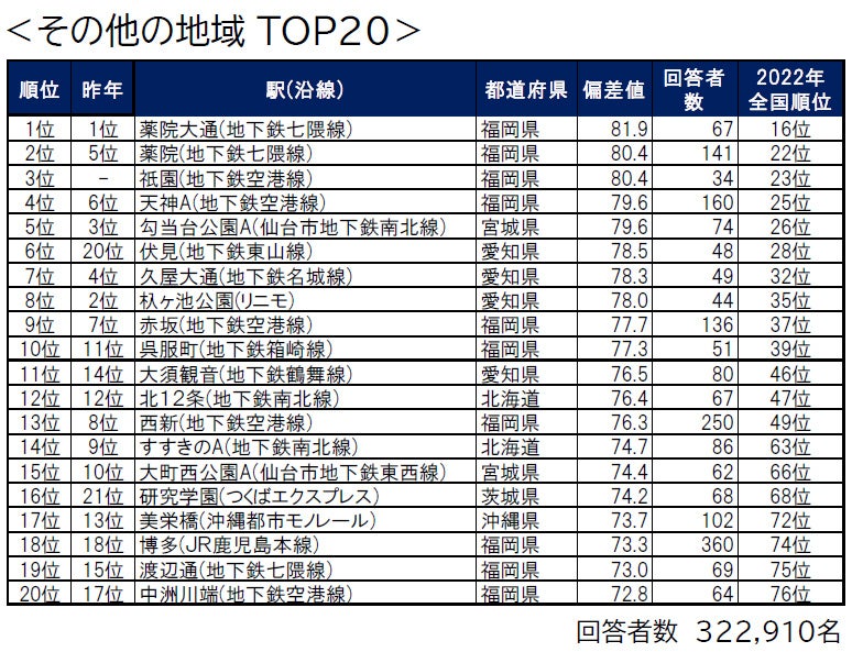 ●その他の地域では、1位は3年連続で薬院大通、2位は薬院、3位は昨年回答者数30名未満で集計対象外だった祇園で、トップ3は全て福岡県の駅となっています。トップ10の地域別では福岡県が最も多く6駅、次いで愛知県の3駅、宮城県の1駅という結果になっています。