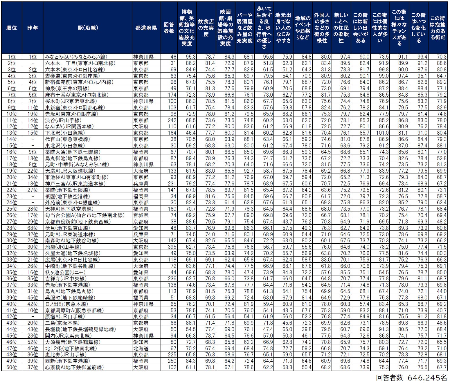 ●トップ10の駅は、いずれも「飲食店の充実度」、「外国人の多さなどの街の多様性」、「この街には新しい出会いがある」、「この街には個性的な人が多い」、「この街には様々なチャンスがある」、「この街はいつも変化している」の項目について偏差値70以上の高い評価を得ています。