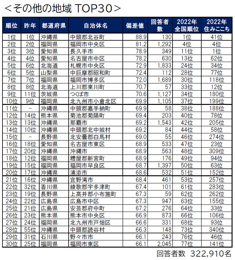 ●その他の地域のトップ10は、9位の茨城県つくば市(昨年11位)以外は、順位に変動はあるものの昨年と顔ぶれは同じです。トップ30では、昨年の回答者数が50名未満で集計対象外だった沖縄県中頭郡嘉手納町(11位)や、長野県北安曇郡白馬村(15位)が初ランクインしています。28位には沖縄県中頭郡読谷村が、昨年55位から大きく順位を上げてトップ30入りしています。