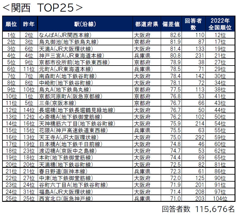 ●関西では、昨年2位のなんばAが1位です。トップ25の地域別では、大阪府が15駅、京都府と兵庫県がそれぞれ5駅ランクインしています。