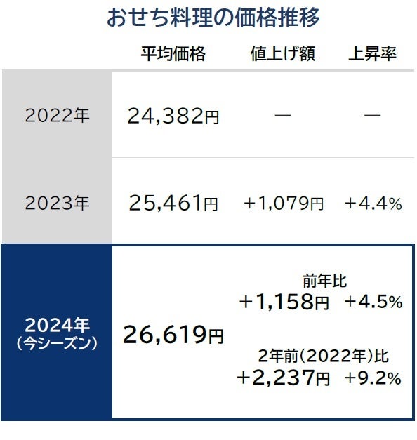 お正月の縁起物として欠かせないお祝い料理「おせち」でも値上げが続いている。全国の大手コンビニエンスストアや百貨店、スーパー、著名な日本料理店など計110社で販売されるおせち料理(三段重または3~4人前分)の価格を調査した結果、2024年正月シーズンの平均価格は2万6619円(税込)だった。1年前(23年正月、「昨シーズン」)の2万5461円に比べて1158円、率にして4.5%の値上がりとなったほか、2年前の22年正月シーズンに比べると2237円・9.2%の値上がりとなった。2年間で1割以上の値上がりとなったクリスマスケーキに比べ、おせち料理の値上げは小幅にとどまっている。