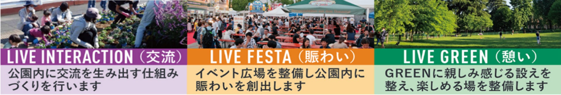 本プロジェクトのコンセプトである「LIVE(活き活きと暮らす)×PARK」の実現のため、1区~3区それぞれに以下の「LIVE」をテーマとした場の整備を計画しています。