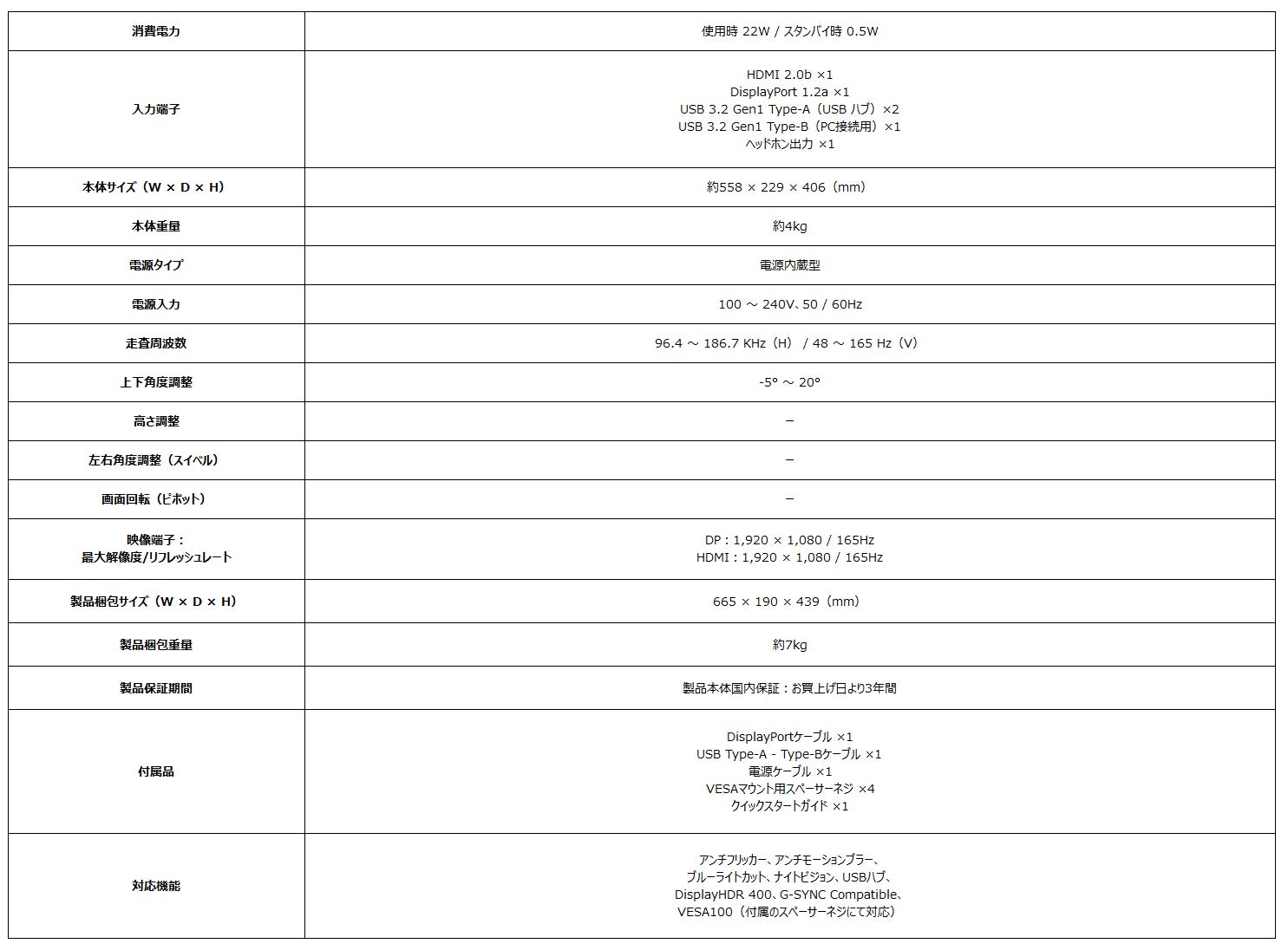 「Optix G251F」は従来のIPSパネルと比べ4倍の駆動速度で高画質と高速描写を両立したRAPID IPSパネルにより高画質・低遅延でゲーム楽しむことができ、24.5インチ・フルHD(1,920 × 1,080)で競技性の高いゲームに最適な画面サイズとなります。リフレッシュレート165Hz、応答速度1ms(GTG)の高いスペックを誇り、ゲーミング機能にリアルな映像を楽しめるDisplay HDR400、カクつきやズレの無いゲームプレイが可能なG-SYNC Compatible、暗い場所の視認性を上げるナイトビジョン、黒挿入機能であるアンチモーションブラー(MPRT)を搭載し、快適なゲームプレイをサポートします。また、目に優しい機能としてフリッカーを抑制するアンチフリッカー、ブルーライトカット機能も備え、長時間の使用でも目への疲労を軽減します。入力端子はHDMI 2.0b ×1、DisplayPort 1.2a ×1、に対応しており、PCとゲーム機など複数の機器を接続する事が可能で、USB 3.2 Gen1 Type-A端子をモニターに備えており、USBハブとして利用することが可能です。さらに、VESA規格にも対応しており、付属のスペーサーネジを使用する事でモニターアームに取り付け机の上のスペースを有効利用する事が可能です。