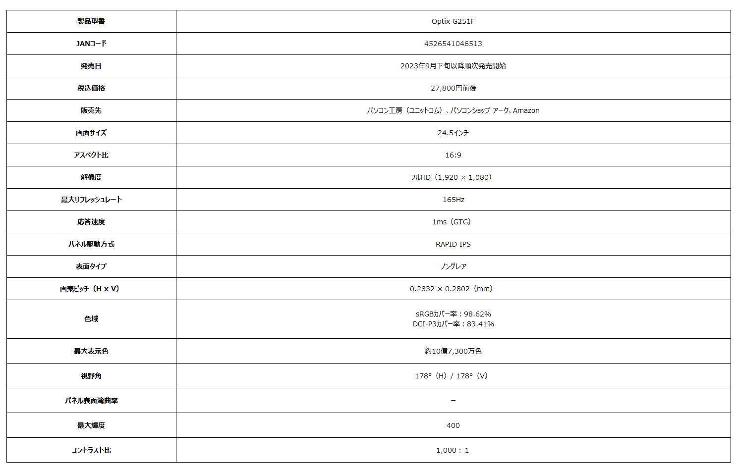 RAPID IPSパネル搭載で高速描写と高画質を両立したゲーミングモニター24.5インチ、リフレッシュレート165Hz、応答速度1ms(GTG)「Optix G251F」発売