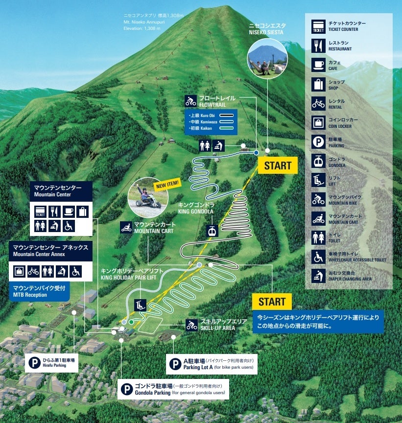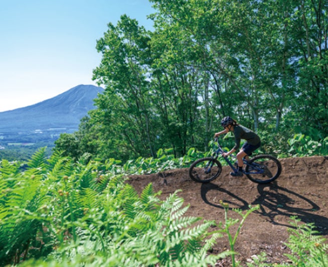 2024 シーズンより再開したニセコ東急 グラン・ヒラフのバイクパークは、ゴンドラ*山頂駅からスター トするフロートレイルで、斜度 37°から疾走するというスリル満点のコースです。今年度は新たにキング ホリデーペアリフト*の運行開始に伴いゲレンデ中腹より下の緩やかな高低差が少ないコースのみの走行が 可能になり、お子さまやマウンテンバイク初心者の方でもフロートレイルに挑戦しやすくなりました。ま たスタート地点まで歩いてアクセスするスキルアップエリア(無料)では、バンクやシーソーなどを使用 し、実際にコースを走行する前にウォーミングアップすることも可能です。 マウンテンバイクパーク整備にあたり、地元事業者や関係者との連携を通じて、地域の観光資源として の価値向上を目指します。持続可能な観光資源開発の観点から、水はけや斜面の自然な流れを活かしたト レイルを制作するとともに、在来植物の保全を前提とした必要最低限の伐採によるライン取り、林内環境 を壊さないための重機搬入や作業ルートの最適化を心がけています。