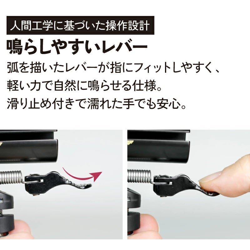 弧を描いたレバーが指にフィットしやすく、軽い力で自然に鳴らせる仕様です。