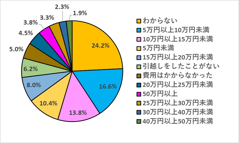 引越しにかかった費用については、「わからない」を除くと、「5万円以上10万円未満」が16.6%、「10万円以上15万円未満」が13.8%、「5万円未満」が10.4%という順になりました。