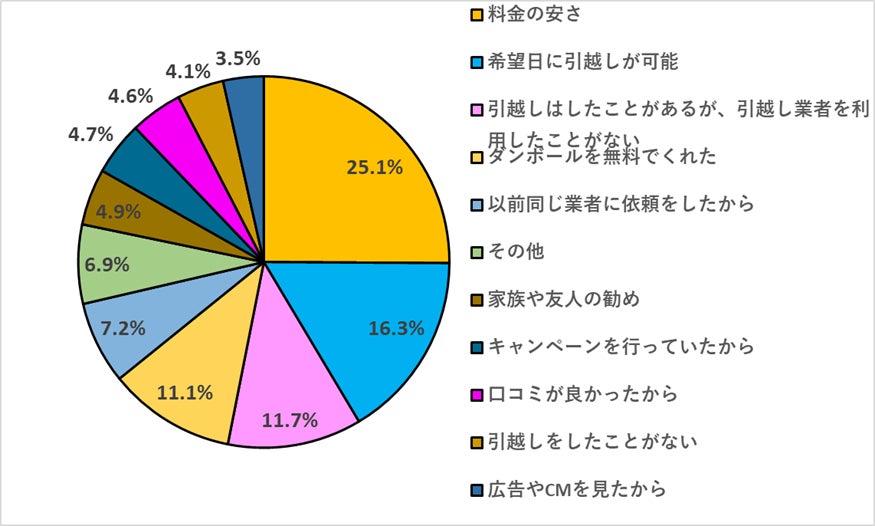 引越し業者を選んだ理由については、「料金の安さ」が25.1%、「希望日に引越しが可能」が16.3%、「引越しはしたことがあるが、引越し業者を利用したことがない」が11.7%という順になりました。