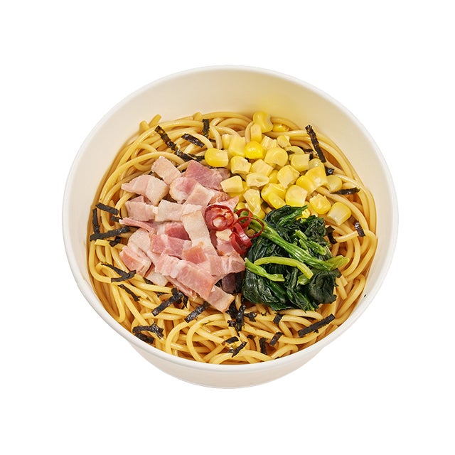 定番具材のベーコンとコーンを和風出汁の風味感じるパスタと一緒に味わう一品!