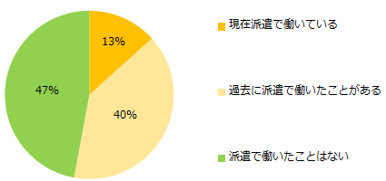 派遣で働いた経験について伺うと、53%が「派遣で働いたことがある」(現在派遣で働いている:13%、過去に派遣で働いたことがある:40%)、47%が「派遣で働いたことはない」と回答しました。