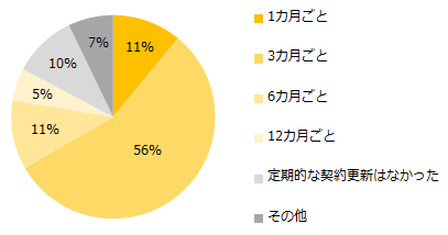 現在派遣で働いている方に、契約更新のタイミングについて伺うと、最多は「3カ月ごと」(56%)でした。