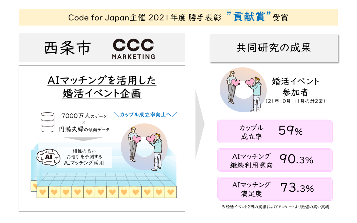 CCCマーケティングと西条市が行った共同研究において、2022月1月5日に発表した成果(https://www.ccc.co.jp/news/2021/20210105_002254.html)のとおり、CCCマーケティングのAIマッチングが西条市におけるカップル成立および成婚数の向上へ寄与したことが「ビッグデータを活用したライフスタイル分析によるマッチング率及び成婚率向上プロジェクト」として評価された結果です。