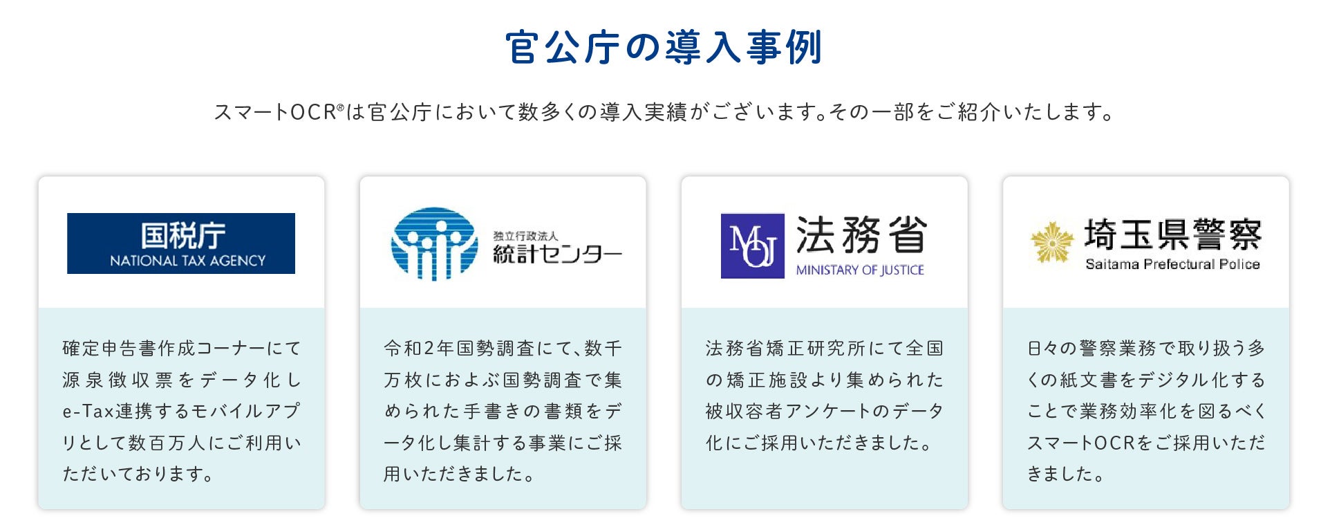 インフォディオのAI-OCRクラウドサービス「スマートOCR®」のエンジンを利用したAPIサービスであり、官公庁・自治体・金融機関をはじめとした多くの実績を持つAI-OCRエンジンです。