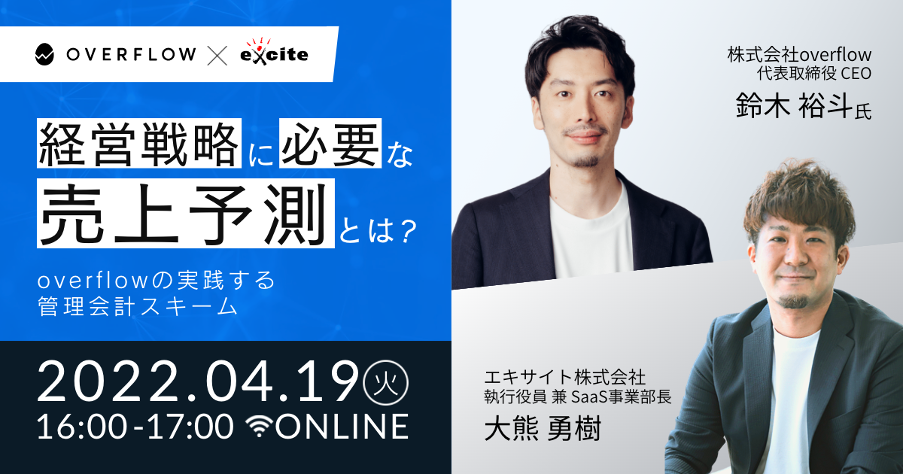 エキサイト株式会社(所在地:東京都港区、代表取締役社長:西條晋一、以下「エキサイト」)は、株式会社overflow(本社:東京都港区、代表取締役: 鈴木裕斗・田中慎)の代表取締役 鈴木裕斗氏を迎え、「経営戦略に必要な売上予測とは?overflowの実践する管理会計スキーム」をテーマに参加費無料のウェビナーを開催することをお知らせします。