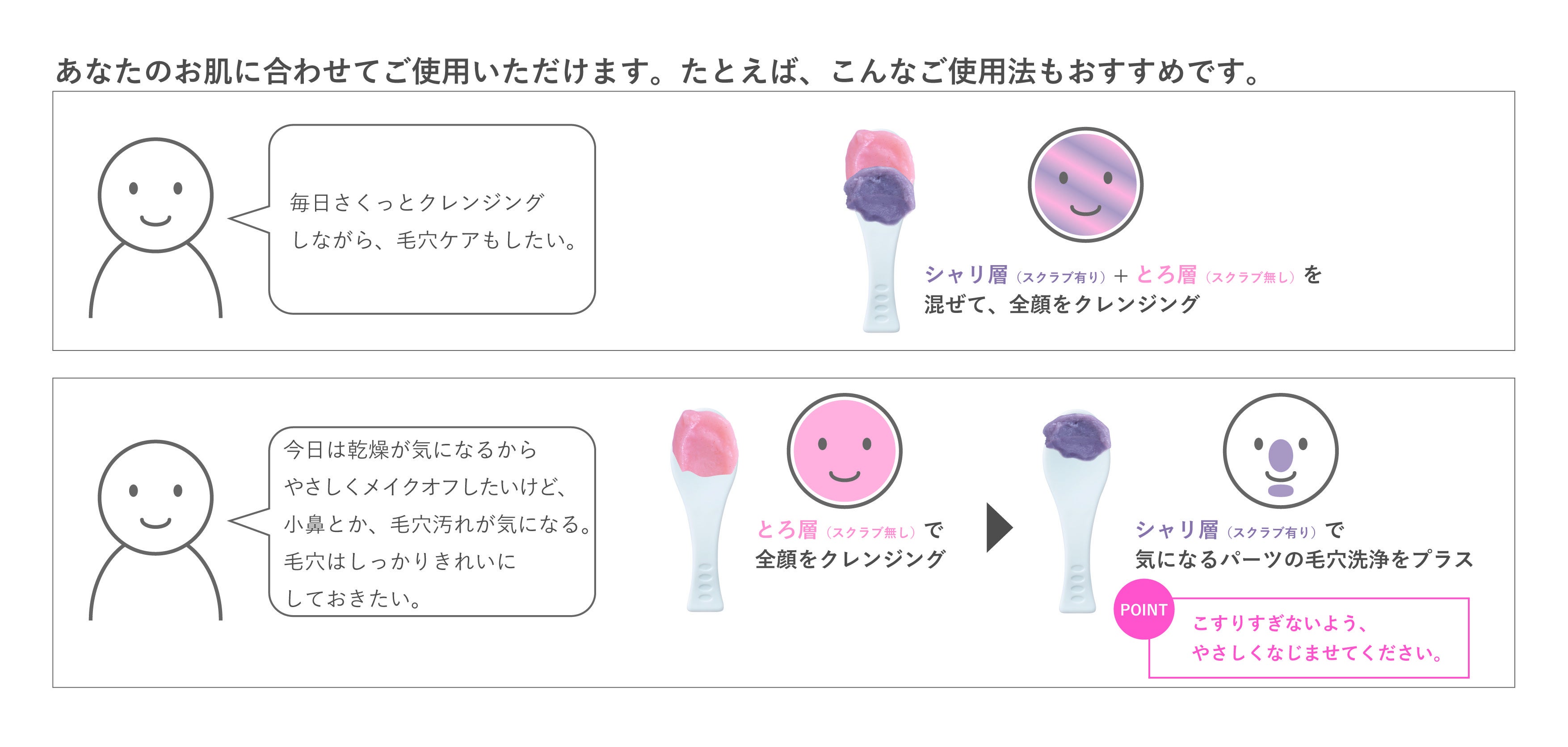スクラブクレンジングとバームクレンジングを混ぜ合わせて使うことで、メイクオフしながら毛穴もしっかりピカピカに。その日の肌状態に合わせてお好みのブレンドも可能です。
