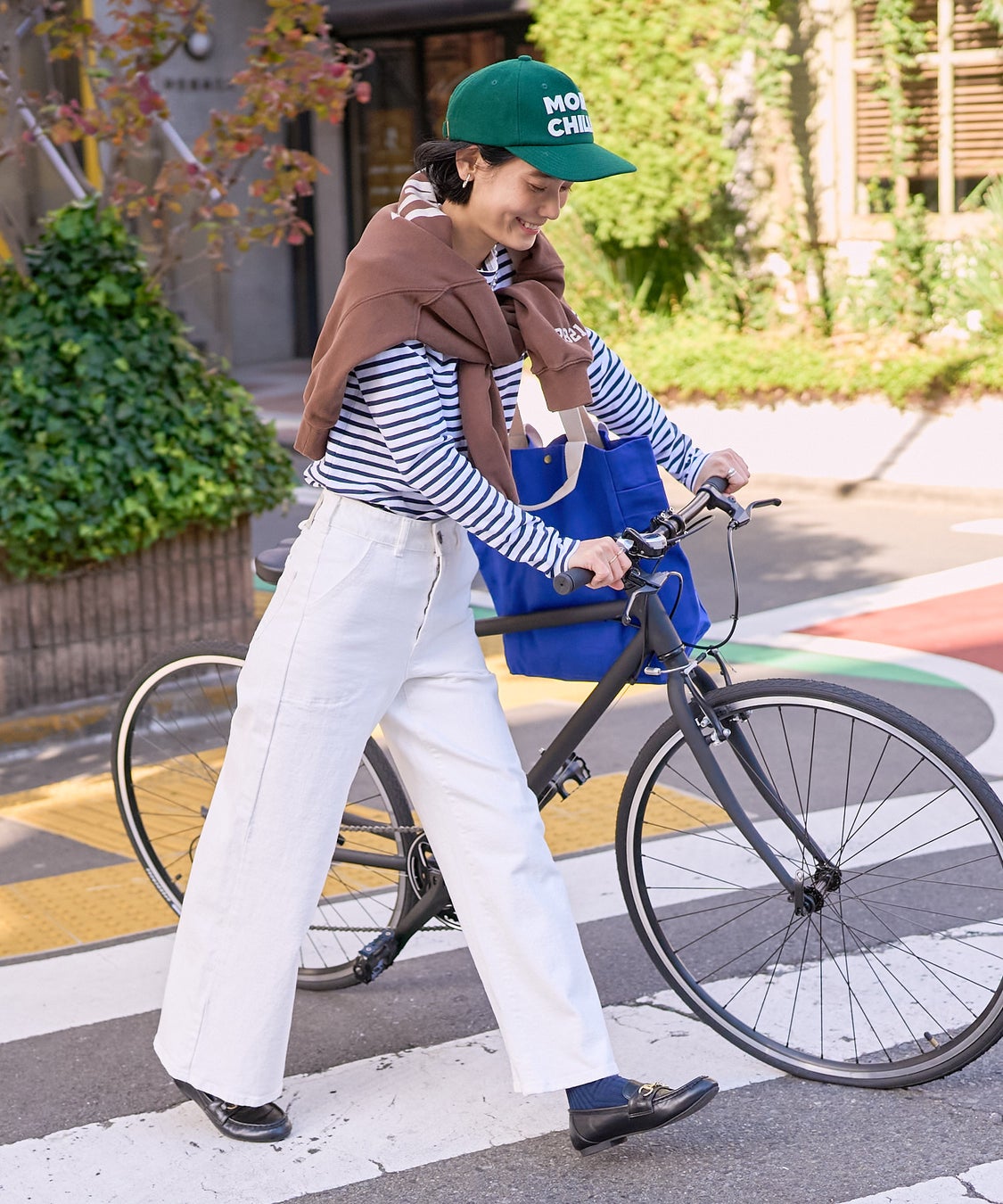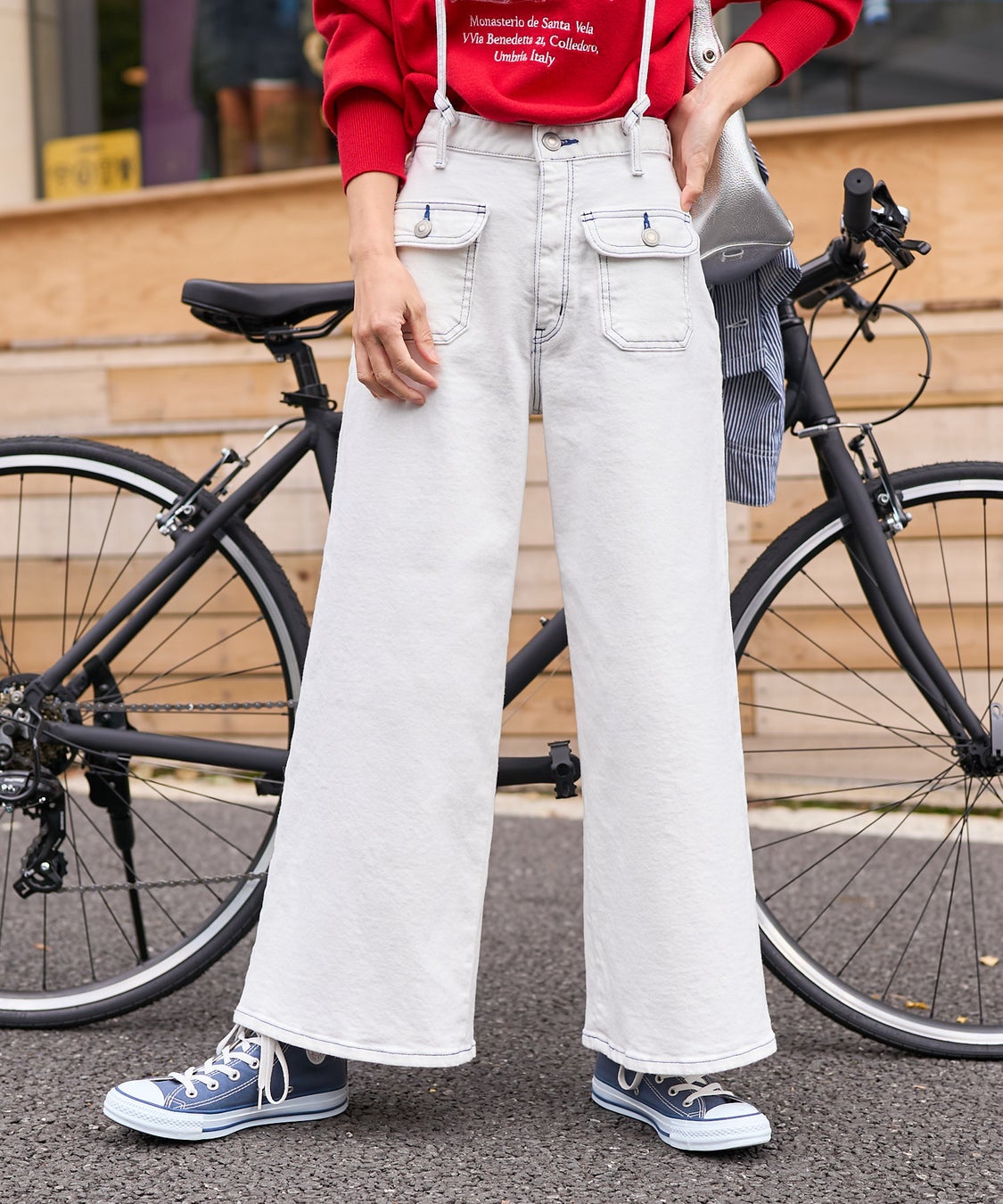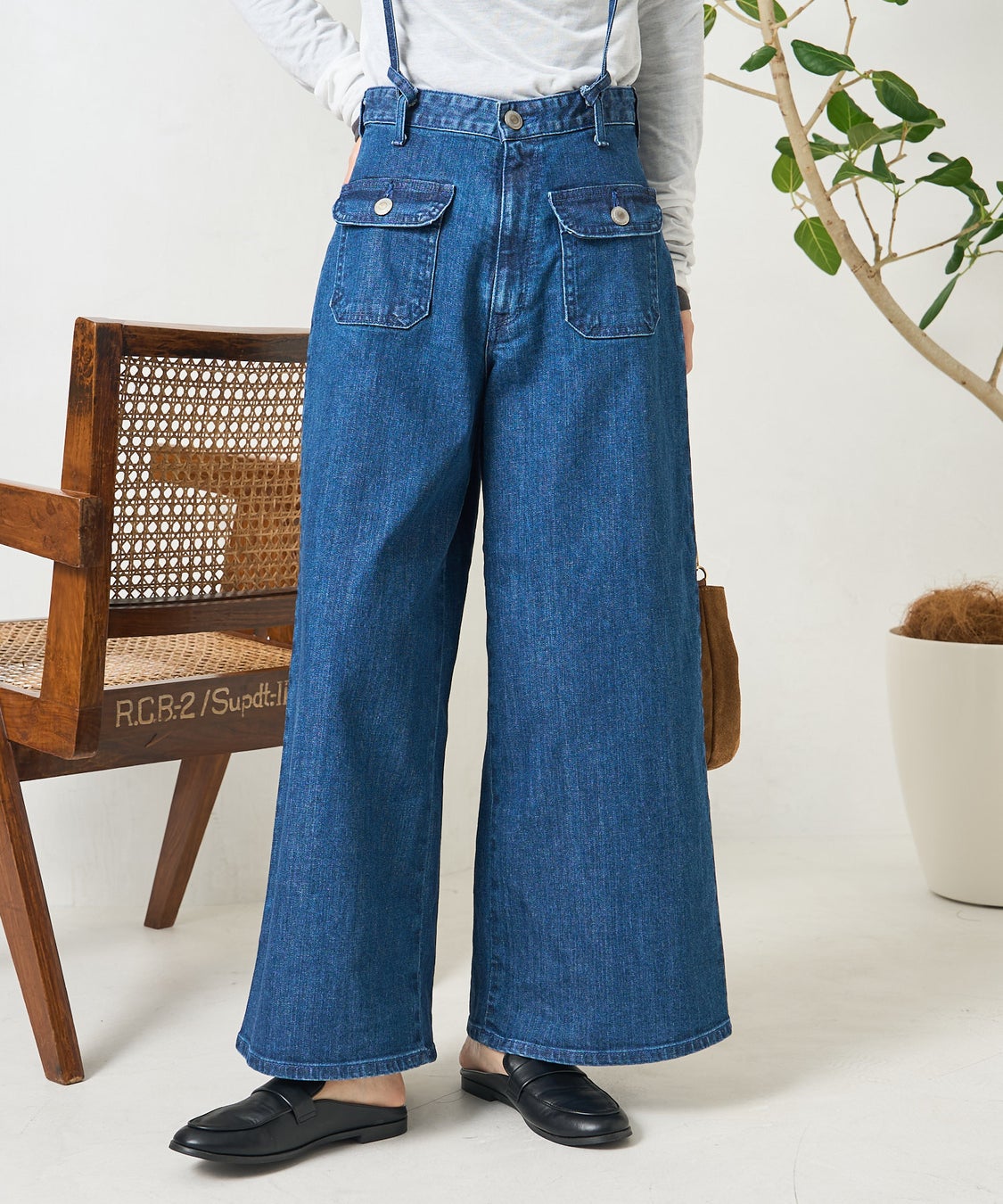 裾に向かってストンと落ちるワイドシルエットが、脚をまっすぐきれいに見せてくれるマリンバギーサロペット。春らしい軽さをプラスしてくれるアイテム。