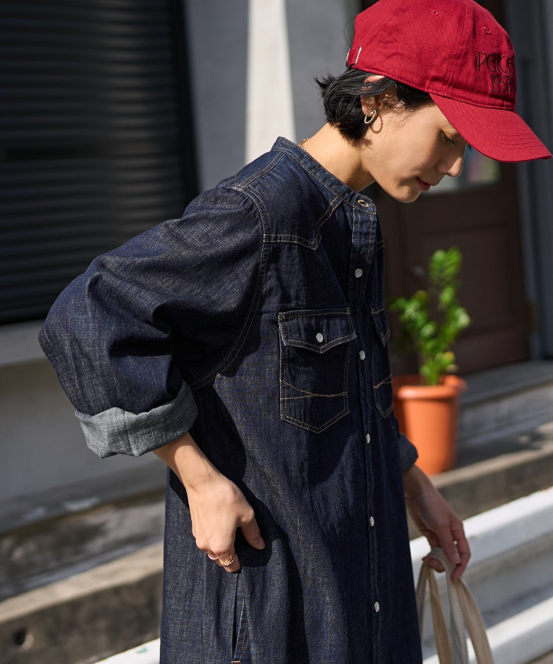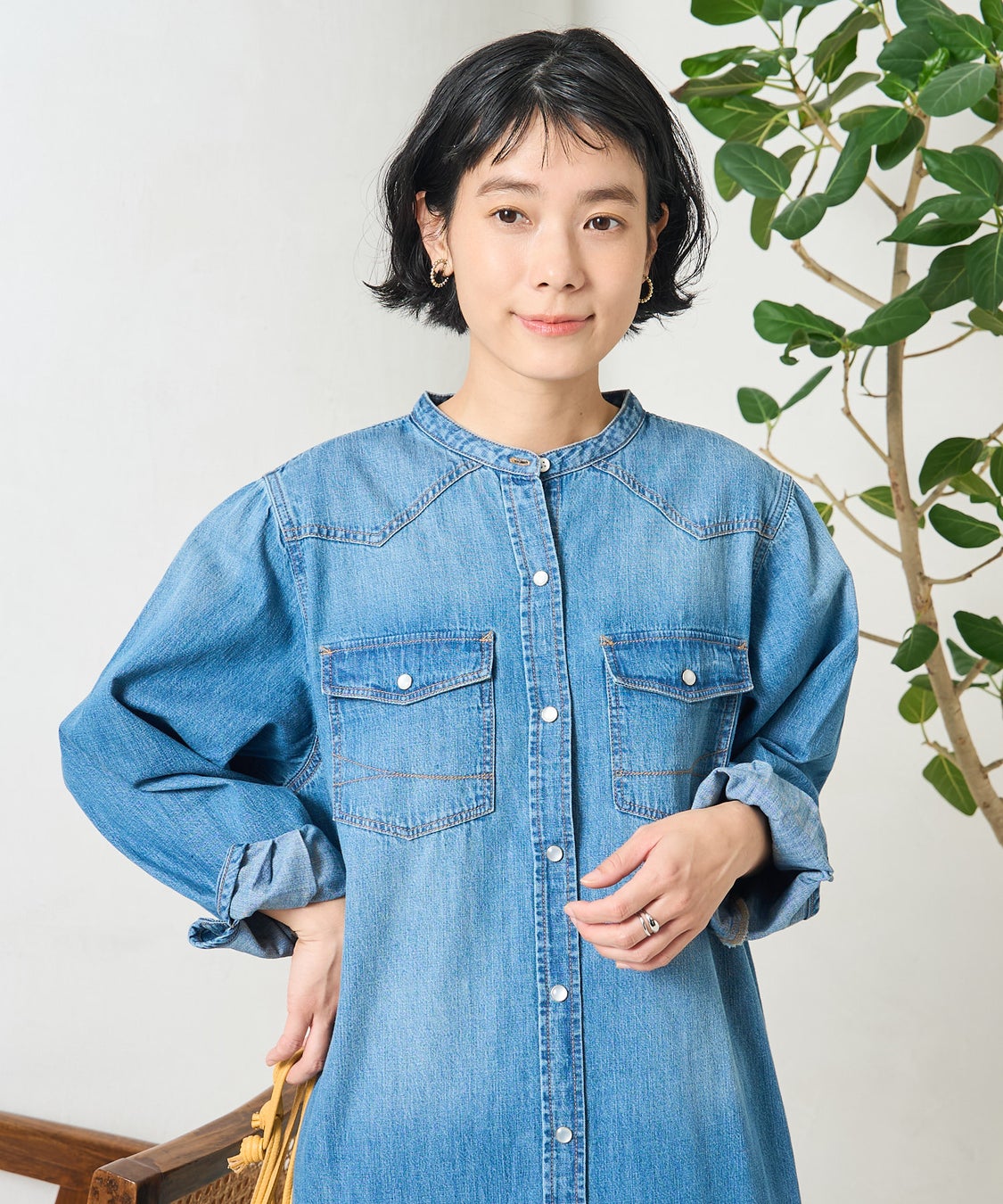 さらっと着られるノーカラーデニムシャツワンピース。程よくゆとりのあるストレートシルエットで体のラインを拾わず、すっきりとした印象に仕上がります。