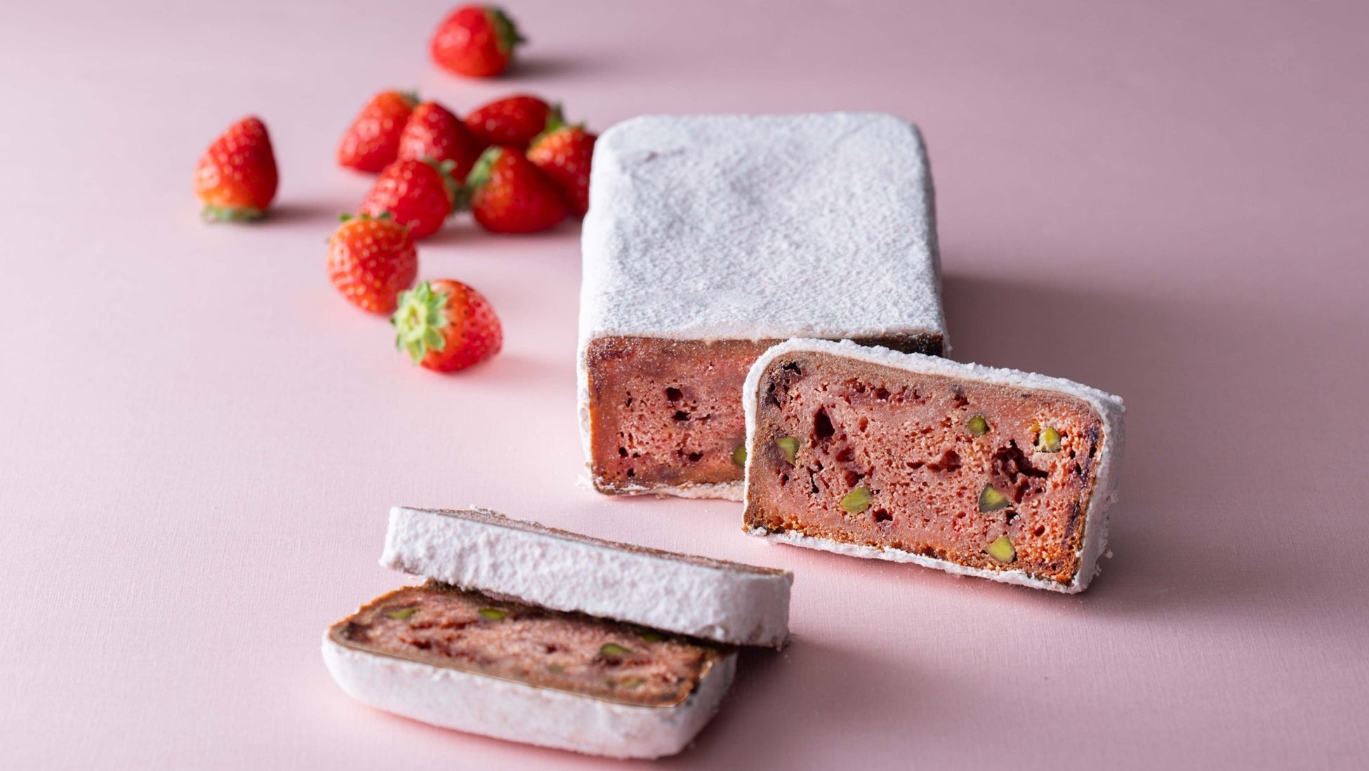●クリスマスの伝統菓子「シュトーレン」の技法を用い創り上げた『プランタン ~苺のお菓子~』は苺味のチョコレートやフリーズドライの苺などを使用。春らしいピンク色の生地に食感、味わいのアクセントとして、鮮やかな緑のピスタチオを散りばめました。